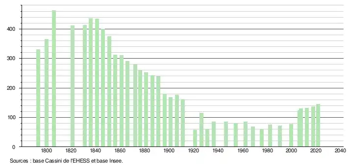 L'évolution du nombre d'habitants est connue à travers les recensements de la population effectués dans la commune depuis 1793. Pour les communes de moins de 10 000 habitants, une enquête de recensement portant sur toute la population est réalisée tous les cinq ans, les populations légales des années intermédiaires étant quant à elles estimées par interpolation ou extrapolation[18]. Pour la commune, le premier recensement exhaustif entrant dans le cadre du nouveau dispositif a été réalisé en 2007[19].