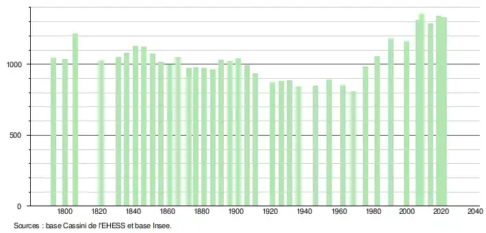 L'évolution du nombre d'habitants est connue à travers les recensements de la population effectués dans la commune depuis 1793. Pour les communes de moins de 10 000 habitants, une enquête de recensement portant sur toute la population est réalisée tous les cinq ans, les populations légales des années intermédiaires étant quant à elles estimées par interpolation ou extrapolation[25]. Pour la commune, le premier recensement exhaustif entrant dans le cadre du nouveau dispositif a été réalisé en 2008[26].
