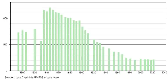 | L'évolution du nombre d'habitants est connue à travers les recensements de la population effectués dans la commune depuis 1793. Pour les communes de moins de 10 000 habitants, une enquête de recensement portant sur toute la population est réalisée tous les cinq ans, les populations légales des années intermédiaires étant quant à elles estimées par interpolation ou extrapolation[26]. Pour la commune, le premier recensement exhaustif entrant dans le cadre du nouveau dispositif a été réalisé en 2007[27]. En 2021, la commune comptait 212 habitants[Note 3], en diminution de 0,47 % par rapport à 2015 (Corrèze : −0,86 %, France hors Mayotte : +1,84 %). |