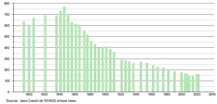 L'évolution du nombre d'habitants est connue à travers les recensements de la population effectués dans la commune depuis 1793. Pour les communes de moins de 10 000 habitants, une enquête de recensement portant sur toute la population est réalisée tous les cinq ans, les populations légales des années intermédiaires étant quant à elles estimées par interpolation ou extrapolation[23]. Pour la commune, le premier recensement exhaustif entrant dans le cadre du nouveau dispositif a été réalisé en 2004[24].