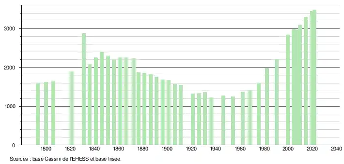 L'évolution du nombre d'habitants est connue à travers les recensements de la population effectués dans la commune depuis 1793. Pour les communes de moins de 10 000 habitants, une enquête de recensement portant sur toute la population est réalisée tous les cinq ans, les populations légales des années intermédiaires étant quant à elles estimées par interpolation ou extrapolation[29]. Pour la commune, le premier recensement exhaustif entrant dans le cadre du nouveau dispositif a été réalisé en 2004[30].