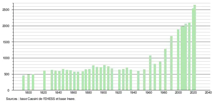 L'évolution du nombre d'habitants est connue à travers les recensements de la population effectués dans la commune depuis 1793. Pour les communes de moins de 10 000 habitants, une enquête de recensement portant sur toute la population est réalisée tous les cinq ans, les populations légales des années intermédiaires étant quant à elles estimées par interpolation ou extrapolation[22]. Pour la commune, le premier recensement exhaustif entrant dans le cadre du nouveau dispositif a été réalisé en 2004[23].