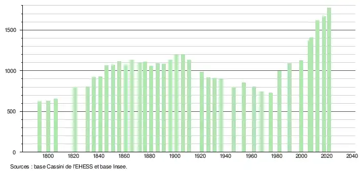 L'évolution du nombre d'habitants est connue à travers les recensements de la population effectués dans la commune depuis 1793. Pour les communes de moins de 10 000 habitants, une enquête de recensement portant sur toute la population est réalisée tous les cinq ans, les populations légales des années intermédiaires étant quant à elles estimées par interpolation ou extrapolation[17]. Pour la commune, le premier recensement exhaustif entrant dans le cadre du nouveau dispositif a été réalisé en 2007[18].
