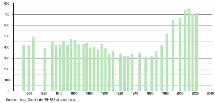 L'évolution du nombre d'habitants est connue à travers les recensements de la population effectués dans la commune depuis 1793. Pour les communes de moins de 10 000 habitants, une enquête de recensement portant sur toute la population est réalisée tous les cinq ans, les populations légales des années intermédiaires étant quant à elles estimées par interpolation ou extrapolation[21]. Pour la commune, le premier recensement exhaustif entrant dans le cadre du nouveau dispositif a été réalisé en 2006[22].