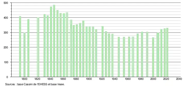 L'évolution du nombre d'habitants est connue à travers les recensements de la population effectués dans la commune depuis 1793. Pour les communes de moins de 10 000 habitants, une enquête de recensement portant sur toute la population est réalisée tous les cinq ans, les populations légales des années intermédiaires étant quant à elles estimées par interpolation ou extrapolation[26]. Pour la commune, le premier recensement exhaustif entrant dans le cadre du nouveau dispositif a été réalisé en 2007[27].