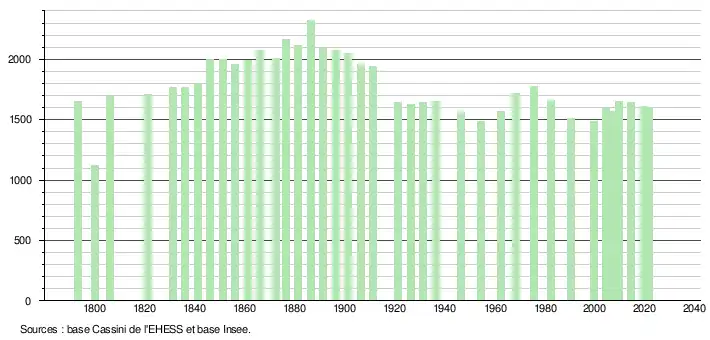 L'évolution du nombre d'habitants est connue à travers les recensements de la population effectués dans la commune depuis 1793. Pour les communes de moins de 10 000 habitants, une enquête de recensement portant sur toute la population est réalisée tous les cinq ans, les populations légales des années intermédiaires étant quant à elles estimées par interpolation ou extrapolation[14]. Pour la commune, le premier recensement exhaustif entrant dans le cadre du nouveau dispositif a été réalisé en 2004[15].