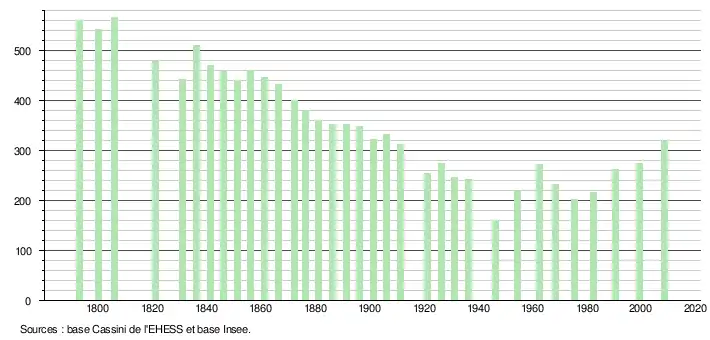 L'évolution du nombre d'habitants est connue à travers les recensements de la population effectués dans la commune depuis 1793. À partir du , les populations légales des communes sont publiées annuellement dans le cadre d'un recensement qui repose désormais sur une collecte d'information annuelle, concernant successivement tous les territoires communaux au cours d'une période de cinq ans. Pour les communes de moins de 10 000 habitants, une enquête de recensement portant sur toute la population est réalisée tous les cinq ans, les populations légales des années intermédiaires étant quant à elles estimées par interpolation ou extrapolation[7]. Pour la commune, le premier recensement exhaustif entrant dans le cadre du nouveau dispositif a été réalisé en 2008[8],[Note 2].