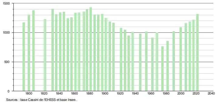 | L'évolution du nombre d'habitants est connue à travers les recensements de la population effectués dans la commune depuis 1793. Pour les communes de moins de 10 000 habitants, une enquête de recensement portant sur toute la population est réalisée tous les cinq ans, les populations légales des années intermédiaires étant quant à elles estimées par interpolation ou extrapolation[25]. Pour la commune, le premier recensement exhaustif entrant dans le cadre du nouveau dispositif a été réalisé en 2006[26]. En 2021, la commune comptait 1 315 habitants[Note 5], en augmentation de 8,32 % par rapport à 2015 (Gironde : +6,88 %, France hors Mayotte : +1,84 %). |