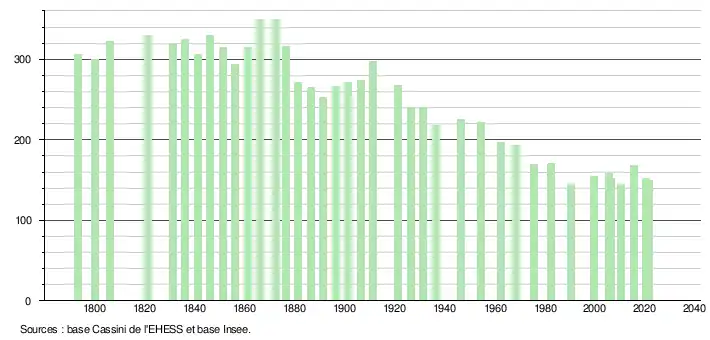 L'évolution du nombre d'habitants est connue à travers les recensements de la population effectués dans la commune depuis 1793. Pour les communes de moins de 10 000 habitants, une enquête de recensement portant sur toute la population est réalisée tous les cinq ans, les populations légales des années intermédiaires étant quant à elles estimées par interpolation ou extrapolation[22]. Pour la commune, le premier recensement exhaustif entrant dans le cadre du nouveau dispositif a été réalisé en 2005[23].
