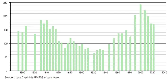 L'évolution du nombre d'habitants est connue à travers les recensements de la population effectués dans la commune depuis 1793. Pour les communes de moins de 10 000 habitants, une enquête de recensement portant sur toute la population est réalisée tous les cinq ans, les populations légales des années intermédiaires étant quant à elles estimées par interpolation ou extrapolation[20]. Pour la commune, le premier recensement exhaustif entrant dans le cadre du nouveau dispositif a été réalisé en 2007[21].