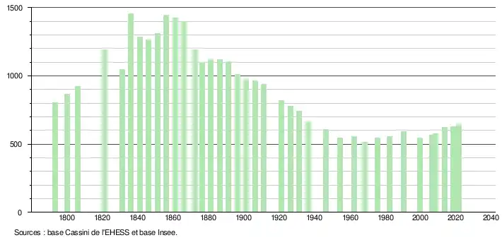 L'évolution du nombre d'habitants est connue à travers les recensements de la population effectués dans la commune depuis 1793. Pour les communes de moins de 10 000 habitants, une enquête de recensement portant sur toute la population est réalisée tous les cinq ans, les populations légales des années intermédiaires étant quant à elles estimées par interpolation ou extrapolation[21]. Pour la commune, le premier recensement exhaustif entrant dans le cadre du nouveau dispositif a été réalisé en 2008[22].