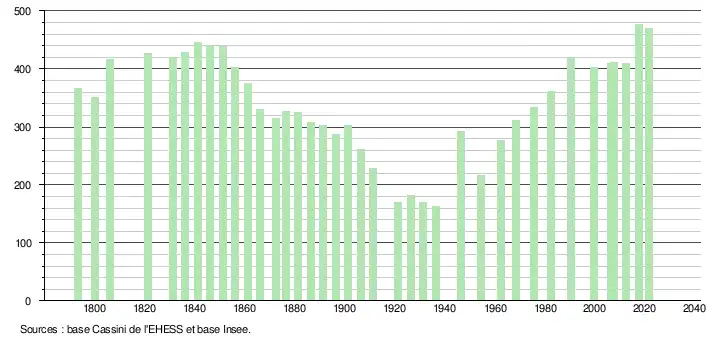L'évolution du nombre d'habitants est connue à travers les recensements de la population effectués dans la commune depuis 1793. Pour les communes de moins de 10 000 habitants, une enquête de recensement portant sur toute la population est réalisée tous les cinq ans, les populations légales des années intermédiaires étant quant à elles estimées par interpolation ou extrapolation[22]. Pour la commune, le premier recensement exhaustif entrant dans le cadre du nouveau dispositif a été réalisé en 2007[23].