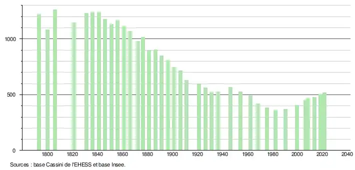 L'évolution du nombre d'habitants est connue à travers les recensements de la population effectués dans la commune depuis 1793. Pour les communes de moins de 10 000 habitants, une enquête de recensement portant sur toute la population est réalisée tous les cinq ans, les populations légales des années intermédiaires étant quant à elles estimées par interpolation ou extrapolation[16]. Pour la commune, le premier recensement exhaustif entrant dans le cadre du nouveau dispositif a été réalisé en 2008[17].