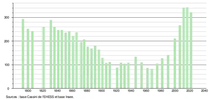 L'évolution du nombre d'habitants est connue à travers les recensements de la population effectués dans la commune depuis 1793. Pour les communes de moins de 10 000 habitants, une enquête de recensement portant sur toute la population est réalisée tous les cinq ans, les populations légales des années intermédiaires étant quant à elles estimées par interpolation ou extrapolation[23]. Pour la commune, le premier recensement exhaustif entrant dans le cadre du nouveau dispositif a été réalisé en 2006[24].
