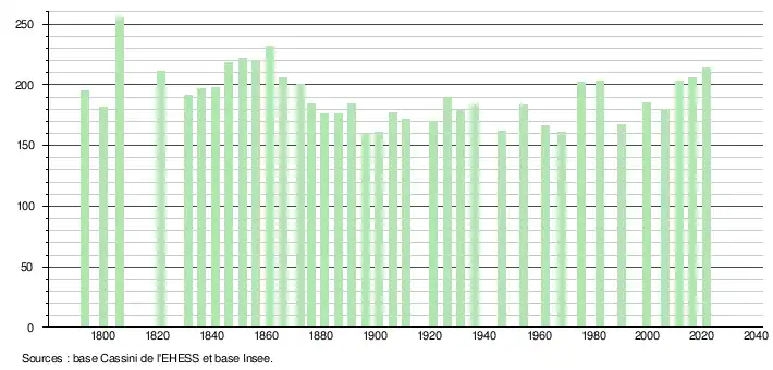 L'évolution du nombre d'habitants est connue à travers les recensements de la population effectués dans la commune depuis 1793. Pour les communes de moins de 10 000 habitants, une enquête de recensement portant sur toute la population est réalisée tous les cinq ans, les populations légales des années intermédiaires étant quant à elles estimées par interpolation ou extrapolation[29]. Pour la commune, le premier recensement exhaustif entrant dans le cadre du nouveau dispositif a été réalisé en 2006[30].