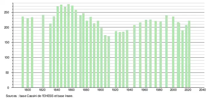 L'évolution du nombre d'habitants est connue à travers les recensements de la population effectués dans la commune depuis 1793. Pour les communes de moins de 10 000 habitants, une enquête de recensement portant sur toute la population est réalisée tous les cinq ans, les populations légales des années intermédiaires étant quant à elles estimées par interpolation ou extrapolation[20]. Pour la commune, le premier recensement exhaustif entrant dans le cadre du nouveau dispositif a été réalisé en 2007[21].