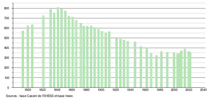 L'évolution du nombre d'habitants est connue à travers les recensements de la population effectués dans la commune depuis 1793. Pour les communes de moins de 10 000 habitants, une enquête de recensement portant sur toute la population est réalisée tous les cinq ans, les populations légales des années intermédiaires étant quant à elles estimées par interpolation ou extrapolation[29]. Pour la commune, le premier recensement exhaustif entrant dans le cadre du nouveau dispositif a été réalisé en 2004[30].