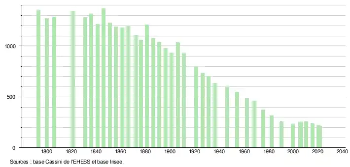 L'évolution du nombre d'habitants est connue à travers les recensements de la population effectués dans la commune depuis 1793. Pour les communes de moins de 10 000 habitants, une enquête de recensement portant sur toute la population est réalisée tous les cinq ans, les populations légales des années intermédiaires étant quant à elles estimées par interpolation ou extrapolation[19]. Pour la commune, le premier recensement exhaustif entrant dans le cadre du nouveau dispositif a été réalisé en 2005[20].