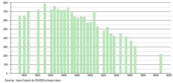 L'évolution du nombre d'habitants est connue à travers les recensements de la population effectués dans la commune depuis 1793. À partir du , les populations légales des communes sont publiées annuellement dans le cadre d'un recensement qui repose désormais sur une collecte d'information annuelle, concernant successivement tous les territoires communaux au cours d'une période de cinq ans. Pour les communes de moins de 10 000 habitants, une enquête de recensement portant sur toute la population est réalisée tous les cinq ans, les populations légales des années intermédiaires étant quant à elles estimées par interpolation ou extrapolation[4]. Pour la commune, le premier recensement exhaustif entrant dans le cadre du nouveau dispositif a été réalisé en [5],[Note 1].