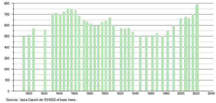 L'évolution du nombre d'habitants est connue à travers les recensements de la population effectués dans la commune depuis 1793. Pour les communes de moins de 10 000 habitants, une enquête de recensement portant sur toute la population est réalisée tous les cinq ans, les populations légales des années intermédiaires étant quant à elles estimées par interpolation ou extrapolation[25]. Pour la commune, le premier recensement exhaustif entrant dans le cadre du nouveau dispositif a été réalisé en 2005[26].