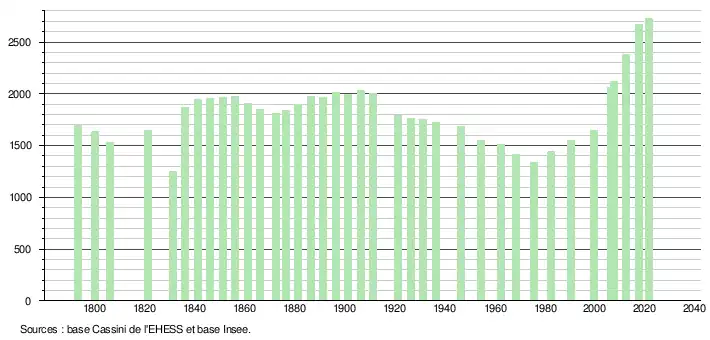 L'évolution du nombre d'habitants est connue à travers les recensements de la population effectués dans la commune depuis 1793. Pour les communes de moins de 10 000 habitants, une enquête de recensement portant sur toute la population est réalisée tous les cinq ans, les populations légales des années intermédiaires étant quant à elles estimées par interpolation ou extrapolation[19]. Pour la commune, le premier recensement exhaustif entrant dans le cadre du nouveau dispositif a été réalisé en 2007[20].