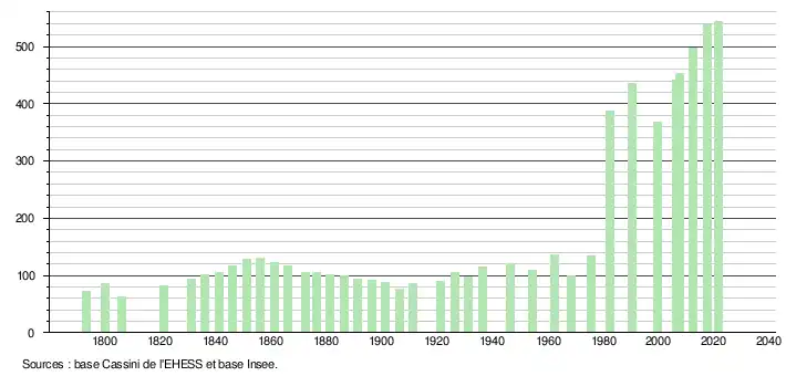 L'évolution du nombre d'habitants est connue à travers les recensements de la population effectués dans la commune depuis 1793. Pour les communes de moins de 10 000 habitants, une enquête de recensement portant sur toute la population est réalisée tous les cinq ans, les populations légales des années intermédiaires étant quant à elles estimées par interpolation ou extrapolation[31]. Pour la commune, le premier recensement exhaustif entrant dans le cadre du nouveau dispositif a été réalisé en 2007[32].