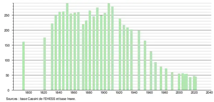 L'évolution du nombre d'habitants est connue à travers les recensements de la population effectués dans la commune depuis 1793. Pour les communes de moins de 10 000 habitants, une enquête de recensement portant sur toute la population est réalisée tous les cinq ans, les populations légales des années intermédiaires étant quant à elles estimées par interpolation ou extrapolation[20]. Pour la commune, le premier recensement exhaustif entrant dans le cadre du nouveau dispositif a été réalisé en 2004[21].