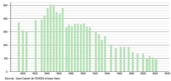 L'évolution du nombre d'habitants est connue à travers les recensements de la population effectués dans la commune depuis 1793. Pour les communes de moins de 10 000 habitants, une enquête de recensement portant sur toute la population est réalisée tous les cinq ans, les populations légales des années intermédiaires étant quant à elles estimées par interpolation ou extrapolation[31]. Pour la commune, le premier recensement exhaustif entrant dans le cadre du nouveau dispositif a été réalisé en 2005[32].