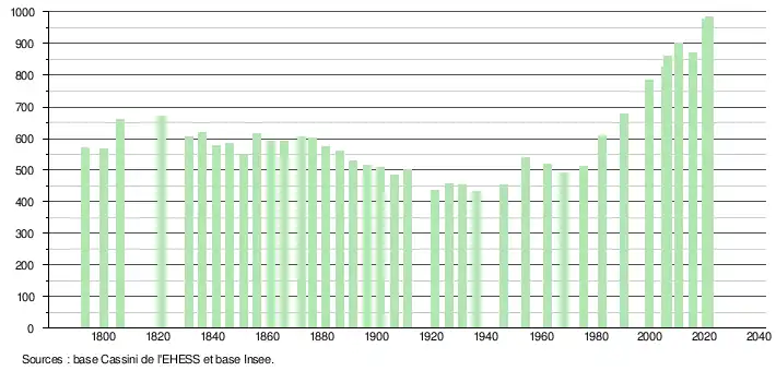 L'évolution du nombre d'habitants est connue à travers les recensements de la population effectués dans la commune depuis 1793. Pour les communes de moins de 10 000 habitants, une enquête de recensement portant sur toute la population est réalisée tous les cinq ans, les populations légales des années intermédiaires étant quant à elles estimées par interpolation ou extrapolation[23]. Pour la commune, le premier recensement exhaustif entrant dans le cadre du nouveau dispositif a été réalisé en 2005[24].