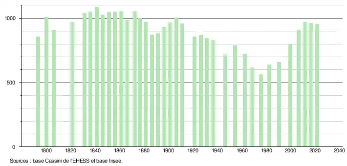 L'évolution du nombre d'habitants est connue à travers les recensements de la population effectués dans la commune depuis 1793. Pour les communes de moins de 10 000 habitants, une enquête de recensement portant sur toute la population est réalisée tous les cinq ans, les populations légales des années intermédiaires étant quant à elles estimées par interpolation ou extrapolation[23]. Pour la commune, le premier recensement exhaustif entrant dans le cadre du nouveau dispositif a été réalisé en 2006[24].