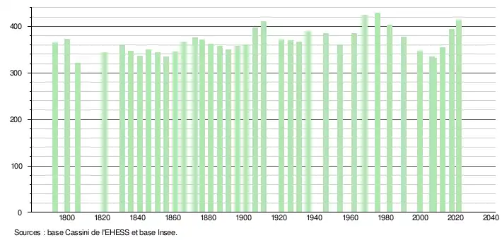 L'évolution du nombre d'habitants est connue à travers les recensements de la population effectués dans la commune depuis 1793. Pour les communes de moins de 10 000 habitants, une enquête de recensement portant sur toute la population est réalisée tous les cinq ans, les populations légales des années intermédiaires étant quant à elles estimées par interpolation ou extrapolation[15]. Pour la commune, le premier recensement exhaustif entrant dans le cadre du nouveau dispositif a été réalisé en 2007[16].