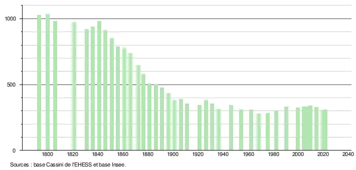 L'évolution du nombre d'habitants est connue à travers les recensements de la population effectués dans la commune depuis 1793. Pour les communes de moins de 10 000 habitants, une enquête de recensement portant sur toute la population est réalisée tous les cinq ans, les populations légales des années intermédiaires étant quant à elles estimées par interpolation ou extrapolation[24]. Pour la commune, le premier recensement exhaustif entrant dans le cadre du nouveau dispositif a été réalisé en 2004[25].