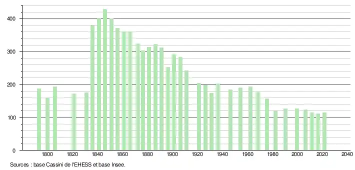 L'évolution du nombre d'habitants est connue à travers les recensements de la population effectués dans la commune depuis 1793. Pour les communes de moins de 10 000 habitants, une enquête de recensement portant sur toute la population est réalisée tous les cinq ans, les populations légales des années intermédiaires étant quant à elles estimées par interpolation ou extrapolation[15]. Pour la commune, le premier recensement exhaustif entrant dans le cadre du nouveau dispositif a été réalisé en 2006[16].
