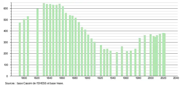 L'évolution du nombre d'habitants est connue à travers les recensements de la population effectués dans la commune depuis 1793. Pour les communes de moins de 10 000 habitants, une enquête de recensement portant sur toute la population est réalisée tous les cinq ans, les populations légales des années intermédiaires étant quant à elles estimées par interpolation ou extrapolation[21]. Pour la commune, le premier recensement exhaustif entrant dans le cadre du nouveau dispositif a été réalisé en 2004[22].