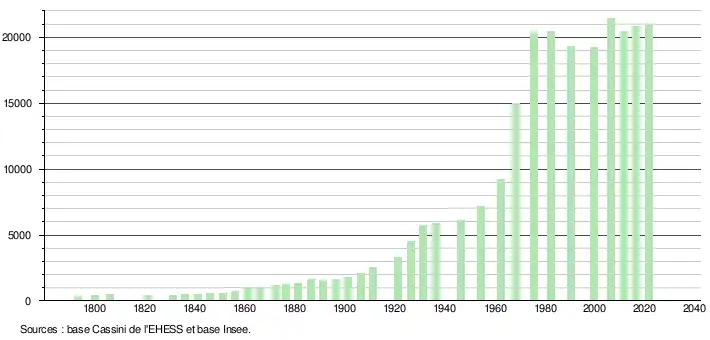 L'évolution du nombre d'habitants est connue à travers les recensements de la population effectués dans la commune depuis 1793. Pour les communes de plus de 10 000 habitants les recensements ont lieu chaque année à la suite d'une enquête par sondage auprès d'un échantillon d'adresses représentant 8 % de leurs logements, contrairement aux autres communes qui ont un recensement réel tous les cinq ans[34],[Note 3].