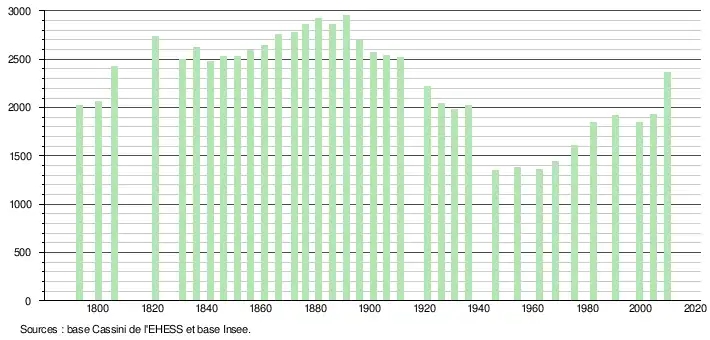 L'évolution du nombre d'habitants est connue à travers les recensements de la population effectués dans la commune depuis 1793. À partir du , les populations légales des communes sont publiées annuellement dans le cadre d'un recensement qui repose désormais sur une collecte d'information annuelle, concernant successivement tous les territoires communaux au cours d'une période de cinq ans. Pour les communes de moins de 10 000 habitants, une enquête de recensement portant sur toute la population est réalisée tous les cinq ans, les populations légales des années intermédiaires étant quant à elles estimées par interpolation ou extrapolation[12]. Pour la commune, le premier recensement exhaustif entrant dans le cadre du nouveau dispositif a été réalisé en 2004[13],[Note 2].