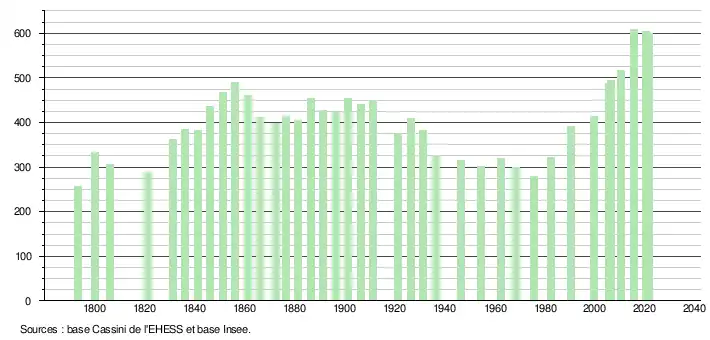 L'évolution du nombre d'habitants est connue à travers les recensements de la population effectués dans la commune depuis 1793. Pour les communes de moins de 10 000 habitants, une enquête de recensement portant sur toute la population est réalisée tous les cinq ans, les populations légales des années intermédiaires étant quant à elles estimées par interpolation ou extrapolation[20]. Pour la commune, le premier recensement exhaustif entrant dans le cadre du nouveau dispositif a été réalisé en 2005[21].