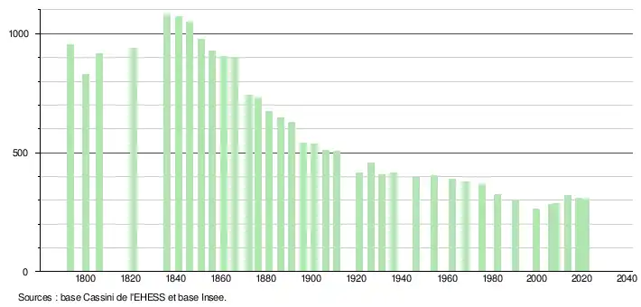 L'évolution du nombre d'habitants est connue à travers les recensements de la population effectués dans la commune depuis 1793. Pour les communes de moins de 10 000 habitants, une enquête de recensement portant sur toute la population est réalisée tous les cinq ans, les populations légales des années intermédiaires étant quant à elles estimées par interpolation ou extrapolation[18]. Pour la commune, le premier recensement exhaustif entrant dans le cadre du nouveau dispositif a été réalisé en 2008[19].