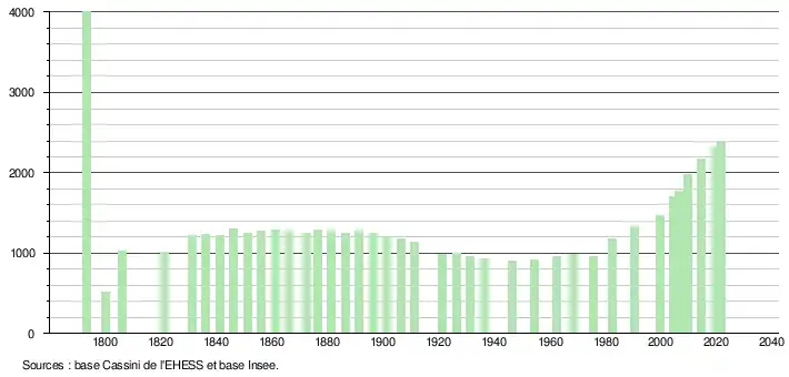 L'évolution du nombre d'habitants est connue à travers les recensements de la population effectués dans la commune depuis 1793. Pour les communes de moins de 10 000 habitants, une enquête de recensement portant sur toute la population est réalisée tous les cinq ans, les populations légales des années intermédiaires étant quant à elles estimées par interpolation ou extrapolation[19]. Pour la commune, le premier recensement exhaustif entrant dans le cadre du nouveau dispositif a été réalisé en 2004[20].