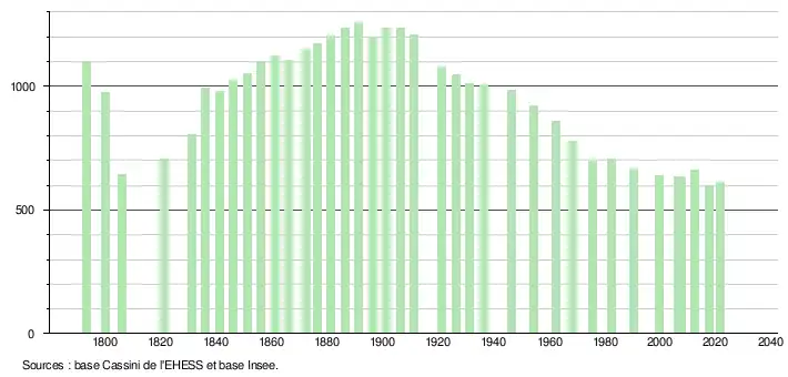 L'évolution du nombre d'habitants est connue à travers les recensements de la population effectués dans la commune depuis 1793. Pour les communes de moins de 10 000 habitants, une enquête de recensement portant sur toute la population est réalisée tous les cinq ans, les populations légales des années intermédiaires étant quant à elles estimées par interpolation ou extrapolation[18]. Pour la commune, le premier recensement exhaustif entrant dans le cadre du nouveau dispositif a été réalisé en 2007[19].