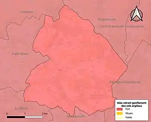 Le retrait-gonflement des sols argileux est susceptible d'engendrer des dommages importants aux bâtiments en cas d’alternance de périodes de sécheresse et de pluie. La totalité de la commune est en aléa moyen ou fort (67,4 % au niveau départemental et 48,5 % au niveau national). Sur les 176 bâtiments dénombrés sur la commune en 2019, 176 sont en aléa moyen ou fort, soit 100 %, à comparer aux 84 % au niveau départemental et 54 % au niveau national. Une cartographie de l'exposition du territoire national au retrait gonflement des sols argileux est disponible sur le site du BRGM[17],[Carte 2].