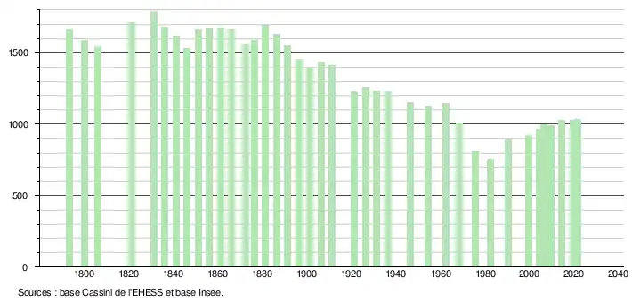 L'évolution du nombre d'habitants est connue à travers les recensements de la population effectués dans la commune depuis 1793. Pour les communes de moins de 10 000 habitants, une enquête de recensement portant sur toute la population est réalisée tous les cinq ans, les populations légales des années intermédiaires étant quant à elles estimées par interpolation ou extrapolation[24]. Pour la commune, le premier recensement exhaustif entrant dans le cadre du nouveau dispositif a été réalisé en 2004[25].