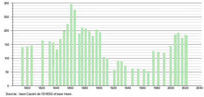 L'évolution du nombre d'habitants est connue à travers les recensements de la population effectués dans la commune depuis 1793. Pour les communes de moins de 10 000 habitants, une enquête de recensement portant sur toute la population est réalisée tous les cinq ans, les populations légales des années intermédiaires étant quant à elles estimées par interpolation ou extrapolation[16]. Pour la commune, le premier recensement exhaustif entrant dans le cadre du nouveau dispositif a été réalisé en 2005[17].