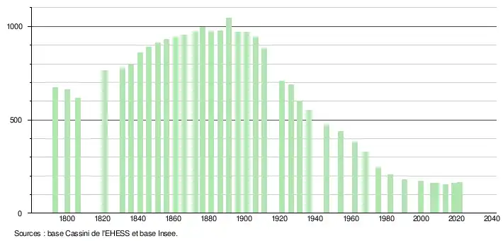 L'évolution du nombre d'habitants est connue à travers les recensements de la population effectués dans la commune depuis 1793. Pour les communes de moins de 10 000 habitants, une enquête de recensement portant sur toute la population est réalisée tous les cinq ans, les populations légales des années intermédiaires étant quant à elles estimées par interpolation ou extrapolation[22]. Pour la commune, le premier recensement exhaustif entrant dans le cadre du nouveau dispositif a été réalisé en 2008[23].