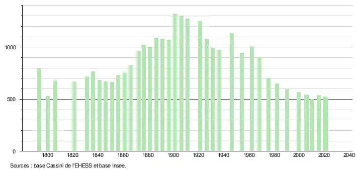 L'évolution du nombre d'habitants est connue à travers les recensements de la population effectués dans la commune depuis 1793. Pour les communes de moins de 10 000 habitants, une enquête de recensement portant sur toute la population est réalisée tous les cinq ans, les populations légales des années intermédiaires étant quant à elles estimées par interpolation ou extrapolation[20]. Pour la commune, le premier recensement exhaustif entrant dans le cadre du nouveau dispositif a été réalisé en 2005[21].