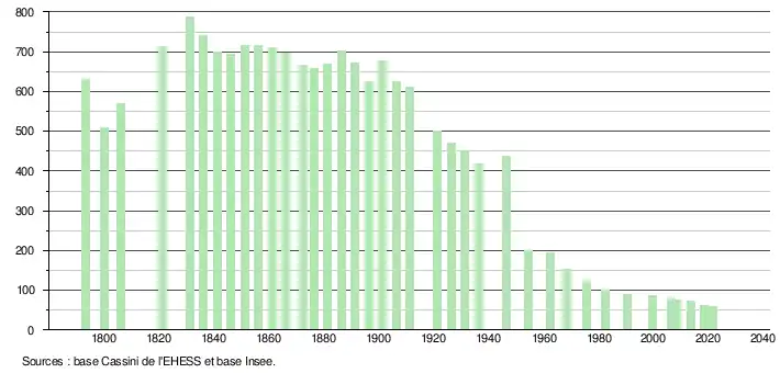 L'évolution du nombre d'habitants est connue à travers les recensements de la population effectués dans la commune depuis 1793. Pour les communes de moins de 10 000 habitants, une enquête de recensement portant sur toute la population est réalisée tous les cinq ans, les populations légales des années intermédiaires étant quant à elles estimées par interpolation ou extrapolation[35]. Pour la commune, le premier recensement exhaustif entrant dans le cadre du nouveau dispositif a été réalisé en 2008[36].