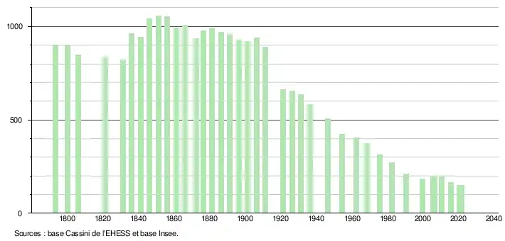 L'évolution du nombre d'habitants est connue à travers les recensements de la population effectués dans la commune depuis 1793. Pour les communes de moins de 10 000 habitants, une enquête de recensement portant sur toute la population est réalisée tous les cinq ans, les populations légales des années intermédiaires étant quant à elles estimées par interpolation ou extrapolation[24]. Pour la commune, le premier recensement exhaustif entrant dans le cadre du nouveau dispositif a été réalisé en 2005[25].