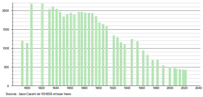 L'évolution du nombre d'habitants est connue à travers les recensements de la population effectués dans la commune depuis 1793. Pour les communes de moins de 10 000 habitants, une enquête de recensement portant sur toute la population est réalisée tous les cinq ans, les populations légales des années intermédiaires étant quant à elles estimées par interpolation ou extrapolation[51]. Pour la commune, le premier recensement exhaustif entrant dans le cadre du nouveau dispositif a été réalisé en 2008[52].