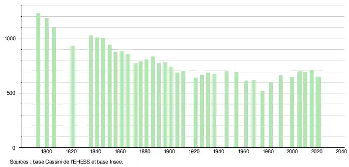 L'évolution du nombre d'habitants est connue à travers les recensements de la population effectués dans la commune depuis 1793. Pour les communes de moins de 10 000 habitants, une enquête de recensement portant sur toute la population est réalisée tous les cinq ans, les populations légales des années intermédiaires étant quant à elles estimées par interpolation ou extrapolation[17]. Pour la commune, le premier recensement exhaustif entrant dans le cadre du nouveau dispositif a été réalisé en 2005[18].