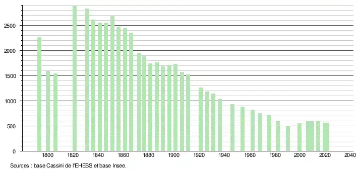 L'évolution du nombre d'habitants est connue à travers les recensements de la population effectués dans la commune depuis 1793. Pour les communes de moins de 10 000 habitants, une enquête de recensement portant sur toute la population est réalisée tous les cinq ans, les populations légales des années intermédiaires étant quant à elles estimées par interpolation ou extrapolation[21]. Pour la commune, le premier recensement exhaustif entrant dans le cadre du nouveau dispositif a été réalisé en 2009[22].